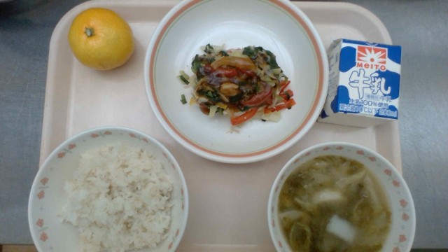 ・麦ごはん ・メカジキのから揚げ生姜ソース ・あとさと根菜の味噌汁 ・みかん