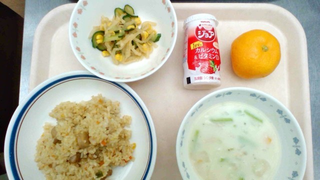 ・ジャンバラヤ ・クラムチャウダー ・大根とコーンのサラダ ・みかん