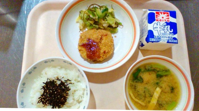 ・ひじきのふりかけごはん ・里芋コロッケ ・キャベツの即席漬け ・豆腐の味噌汁