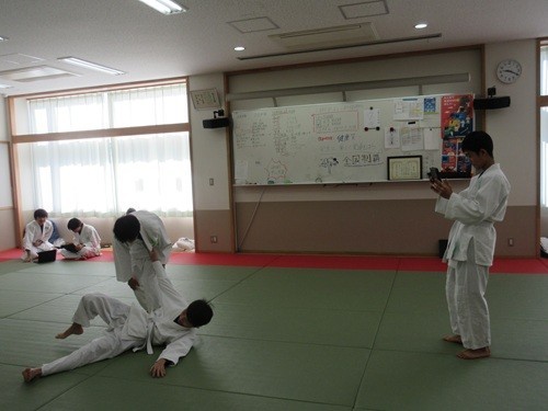 2年1組の理科はアバターが答えるクイズで盛り上がっていました。2年2組の柔道では技の撮影を撮影、3年生の社会科では黒板に新聞が並んでました。