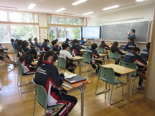 音楽では声楽家の方を招いての授業。腹式呼吸などを学んでいました。写真は2年2組。技術は1年2組。木工です。小さい本棚かな。数学は1年3組です。元気です。