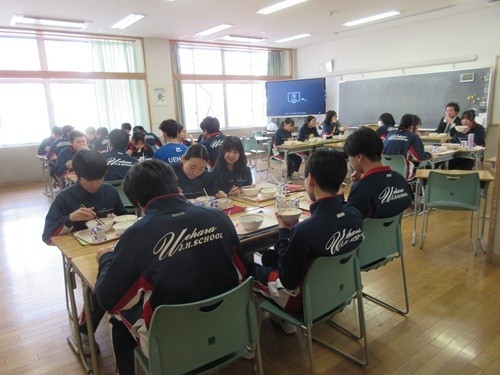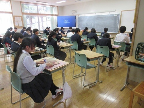 オンライン生徒朝会、1年生の役員が頑張りました。2年生は生徒がもどってきました。念のため、前向き。3年生もそれほど休みが目立ちません。給食は食べ放題です。