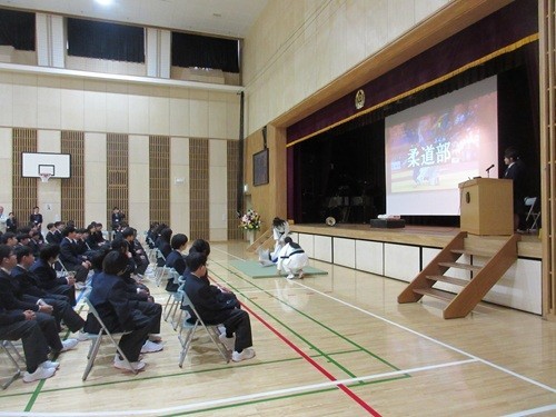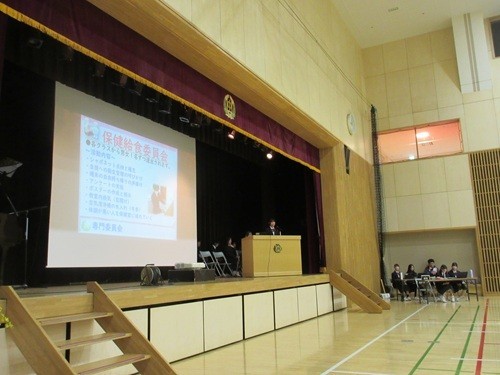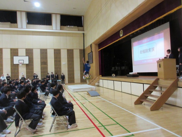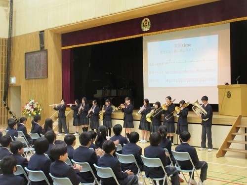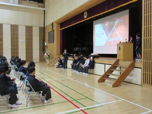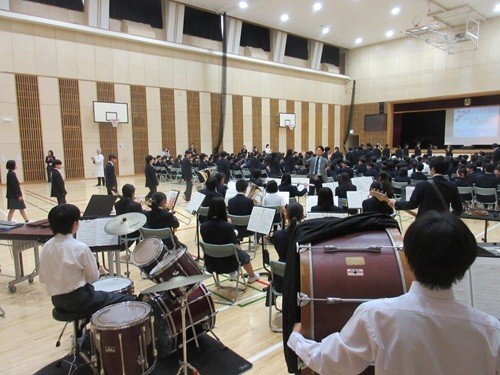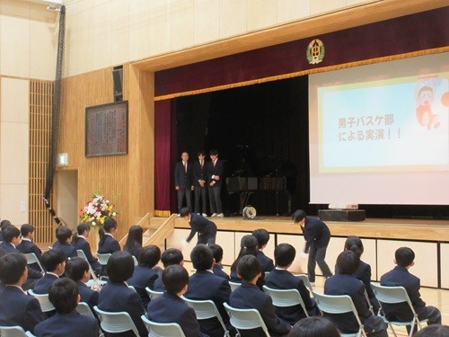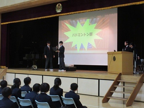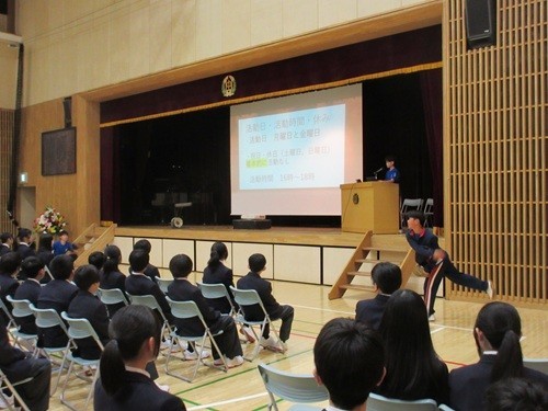 吹奏楽部の演奏で新入生が入場。学校行事や委員会、部活動の説明をしました。部活動紹介は、実演、漫才、一発ギャグありでとても盛り上がっていました。