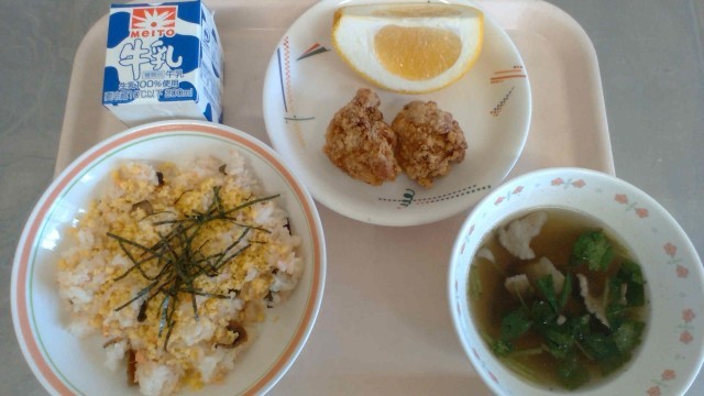 ・鮭ちらし ・鶏のからあげ ・沢煮碗 ・河内晩柑