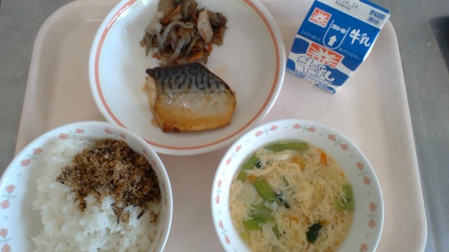 ・ひじきふりかけごはん ・さばのピリ辛みそ焼き ・五目金平 ・かきたま汁