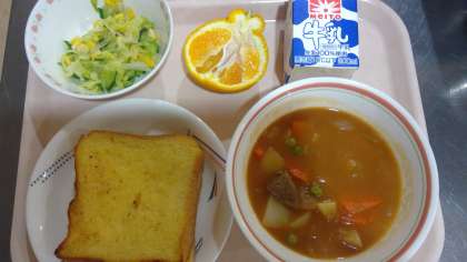 フレンチトーストは、しっかりと卵液に浸してから焼いたので、柔らかく焼きあがっていました。献立表にはありませんが、おまけでデコポン付けたので、ボリュームのある給食になりました。