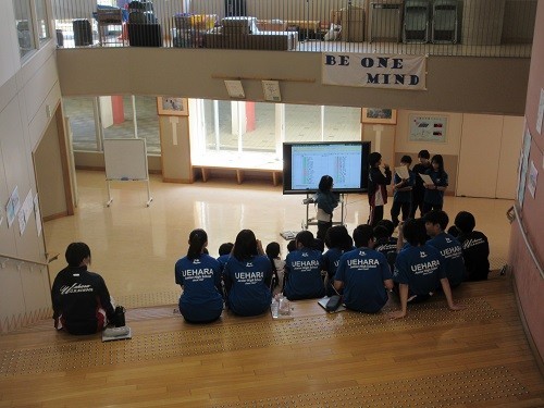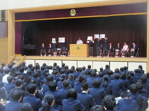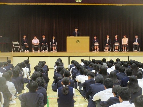 全校生徒による朝会がありました。生徒会や各委員会、学年の代表が目標などを発表しました。どの生徒も堂々と発表しており感心しました。あと、体育祭の学級リレーの相談です。