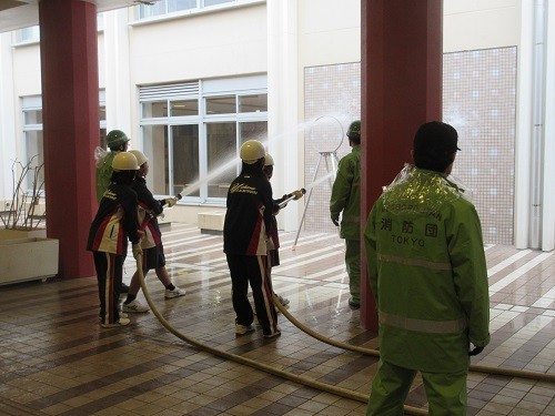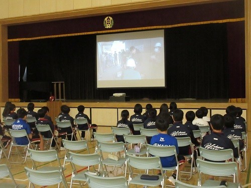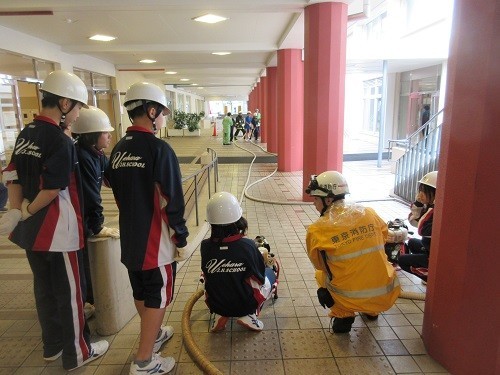 1年生がD級ポンプ訓練を消防署や消防団、地域の方の指導のもと行いました。雨天のため規模を縮小したので、体育館での災害対策の座学とローテーションさせました。モデルになるような大規模な訓練でした。