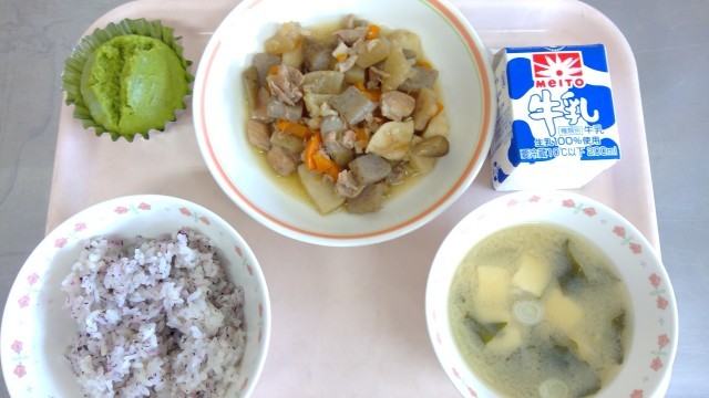 ・ゆかりごはん ・筑前煮 ・豆腐とわかめの味噌汁 ・あしたば蒸しパン