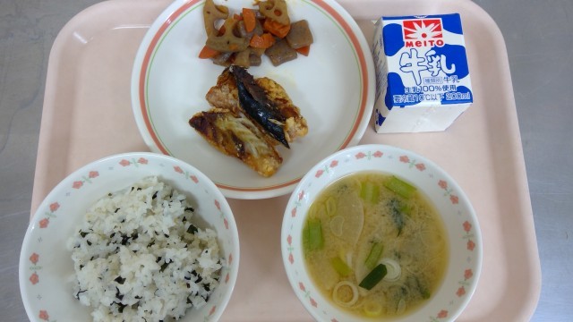 ・わかめごはん ・鯖の竜田揚げ ・こんにゃくのピリリ煮 ・大根の味噌汁