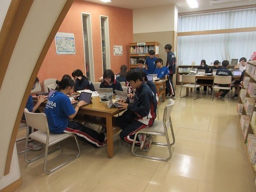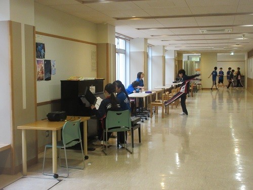 朝と昼休みに音楽室前の廊下にあるピアノから心地よい音楽が流れてきます。上手です。図書室では2年生が技術のレポート作成、昼休みには明星混成チームが台風の目の練習をしていました。