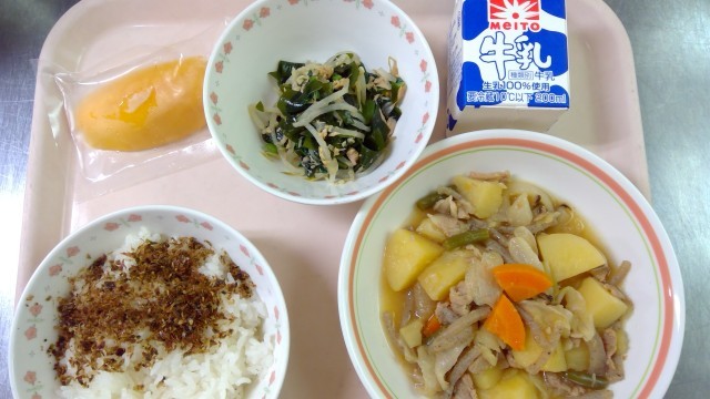 ・ごはん ・手作りおかかふりかけ ・肉じゃが ・ツナとわかめの胡麻醬油 ・冷凍マンゴー
