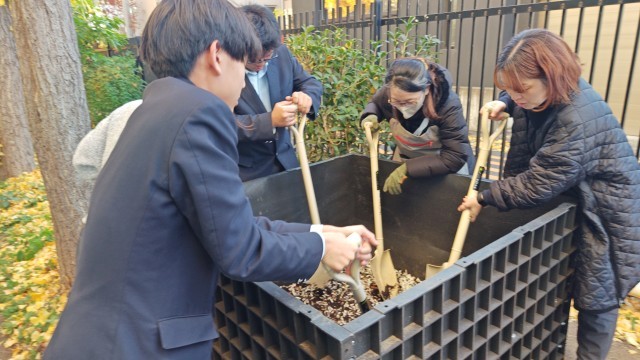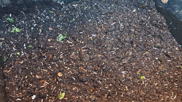 本日、定例作業日でした。給食の野菜残渣・シュレッダークズ・参加者持ち寄りの野菜クズ、そしてスターバックス新宿南口店よりコーヒー豆カス10kgを投入して、切り返し(混ぜる作業)を行いました。