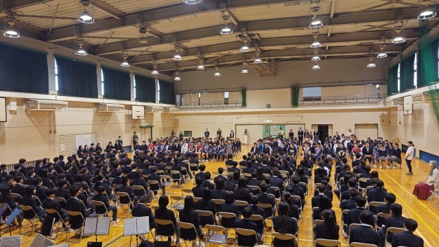 生徒会主催の対面式です。はじめて全校がそろいました!