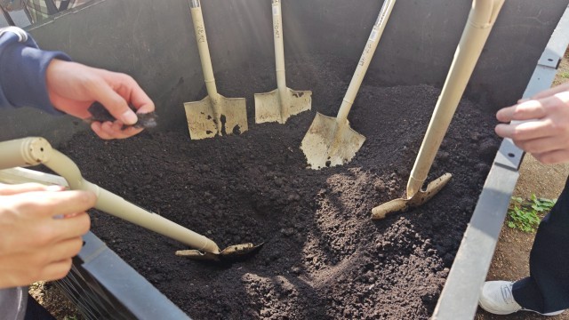 よく掻き混ぜる「切り返し」を行なって土中に酸素を送り込み堆肥の完熟を促しています!また、異物を取り除く作業も進めております。