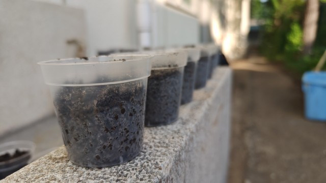 さらに、堆肥の威力を確認するため花壇の土と完成間近の堆肥を混ぜ、土が良く見える透明の植木鉢に入れて「渋谷ルッコラ」(種子を受け継いでいます)の種蒔きをしました。