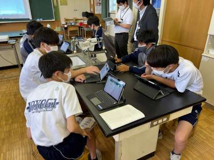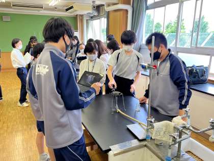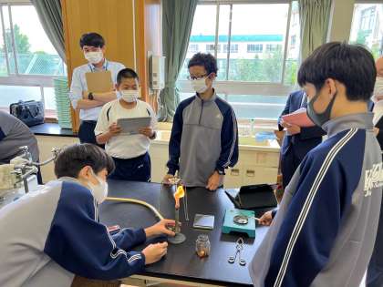 本日は、2年3組も理科の研究授業を行いました。こちらは、今年学校の先生になった1年目の先生対象のモデル授業でしたが、驚きの実験あり、Teamsを使用した共同作業ありで、2年3組の皆さんも集中してしっかり授業に取り組めていました。