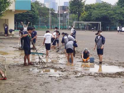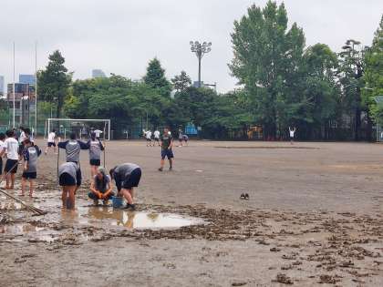 明日の体育祭に向けて、午後から準備を始めています。校庭の水はけが悪いため、いくつもの水溜がありますが、雨が上がったので作業を開始しました。明日は予定どおりに体育祭ができることを願っています。恐らく生徒の皆さんの願いが通じることでしょう。