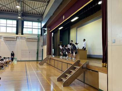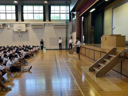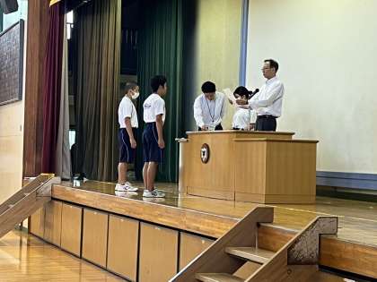 表彰の様子は、水泳部です。また、西原地区のラジオ体操ボランティアとして感謝状を授与しました。最後は、選挙管理委員長より生徒会役員選挙について連絡がありました。