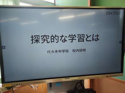 夏休み明けの初日ですが、教員も学びを深めています。校内研修のテーマは「探究的な学習とは」で講師の先生はファシリテーターの小林様をお招きしてご講演をいただきました。教員もグループごとに4つの質問に対して、それぞれ意見交換を行いました。授業改善に向けて理解と学びを深めることができました。