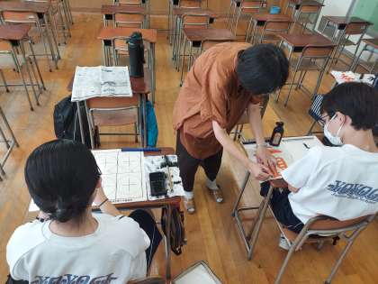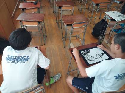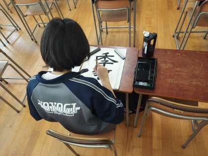 多目的室2Bを使用して書道部が活動しています。書の練習、水墨画の作成と思い思いに活動していました。墨のいいにおいがしていました。