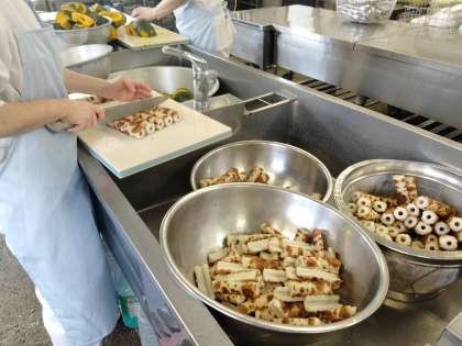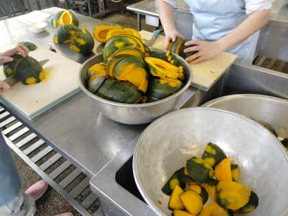 かぼちゃは、当日の納品されたかぼちゃの数を数えてから、何等分に切るか計算しています。