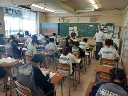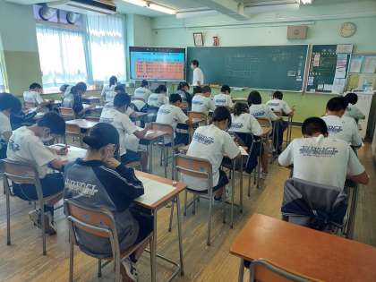 2時間目の3年生、理科のテストです。各学年12学級を巡回しましたが、真剣にテストに臨んでいました。