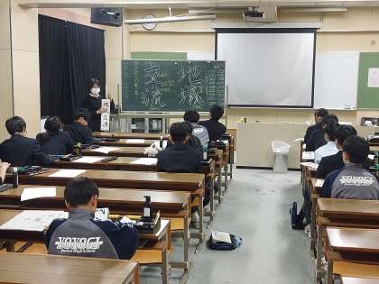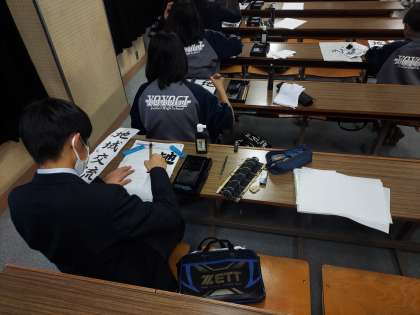 視聴覚室では1年生が書写に取り組んでいました。お題は「地域交流」です。全員が集中している様子がうかがえました。