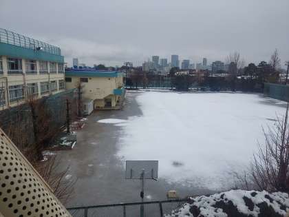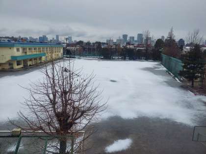 昨日からの雪で代々木中学校の校庭は、雪景色です。雪が積もってしまうと朝の冷え込みで校庭が氷ってしまい、昼間に気温が上がり溶けるといった繰り返しになってしまいます。なかなか元の使える状態になるまで時間がかかってしまいます。