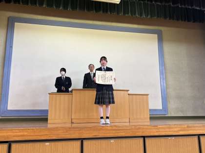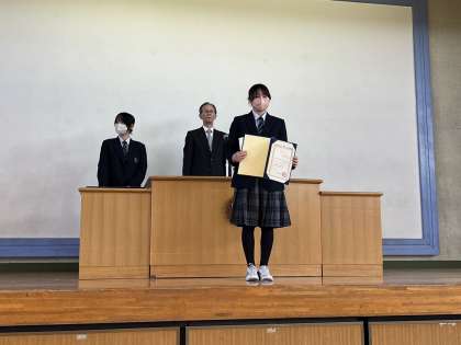 卒業式予行後は、様々な表彰を行いました。渋谷区から表彰されたスポーツクライミング、東京都から表彰されたボーリングのお二人です。
