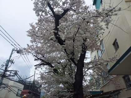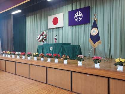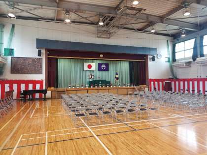 明日の入学式の会場準備が終りました。新入生の皆さんをお待ちしています。正門の桜が見事に咲き誇っています。
