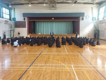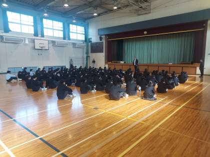 午前中は担任の先生との様々なやり取りがありましたが、5時間目は大体育館にて学年集会を実施いたしました。担任以外の学年の先生方から1年生の皆さんに話がありました。