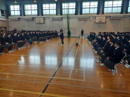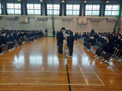 続いて、花束贈呈と新入生の言葉です。対面式後は2年生と3年生は教室に戻り、部活動紹介の様子はリモートにて参加します。部活動紹介のスペースを確保するための工夫です。