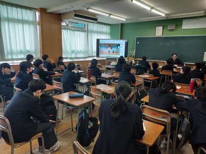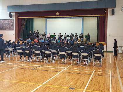 リモートにて部活動紹介の様子を見ている2年生と吹奏楽部の演奏です。明るく爽やかな部活動紹介をする2年生と3年生、さすがです。1年生は、興味のある部活動を、ぜひ体験してみてください。