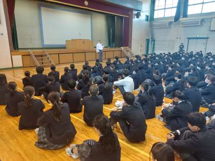 今年度より朝礼がある日には、8時25分を目標に大体育館に集合し、8時30分には朝礼が開始できるように変更しました。素晴らしい整列状態でした。生活指導担当の先生からは、今日まで春の交通安全週間ですが、引き続き交通ルールを守ることや努力義務であるヘルメットの着用について話がありました。