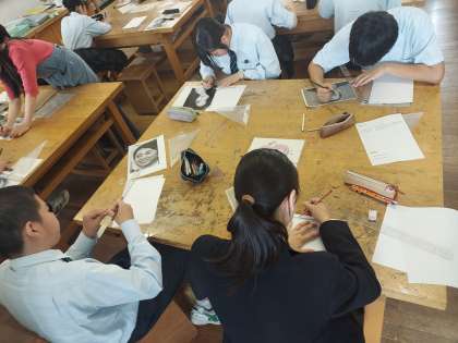 3年生の美術では、模写に取り組んでいました。全員が集中して創作していました。