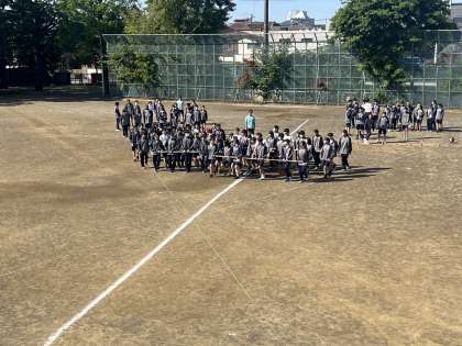 朝から体育祭の集団行動の練習に励んでいます。スポーツ等部活動強化校の風景復活です。