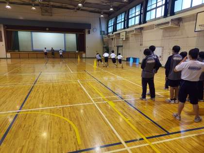 2年生は体育祭の学年練習でした。残念ながら雨のため大体育館と小体育館に分かれ2クラスが台風の目、1クラスが大縄跳びの練習をしていました。