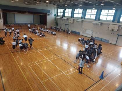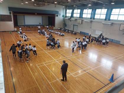 本日の1時間目は、大体育館にて1年生の学年練習が行われていました。学年種目は「いかだ流し」のようです。大変盛り上がっていました。
