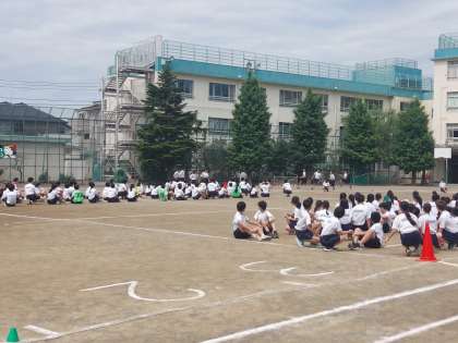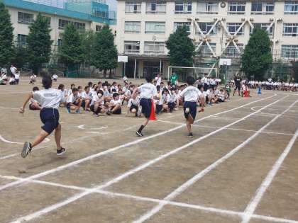 3年生の全員リレーの様子です。各競技の一部のみ実施しています。係の連携と入退場の確認が主な目的です。