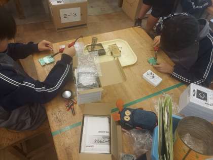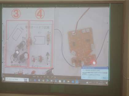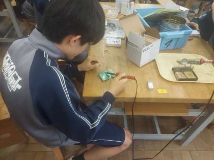 2年生の技術、ラジオの基盤作りのその後です。前回よりも大分作業が進んでいました。はんだ付けでは、再三火傷に注意するよう呼び掛けられていました。