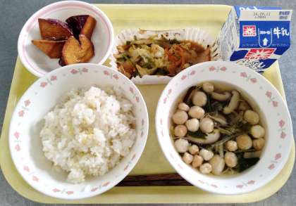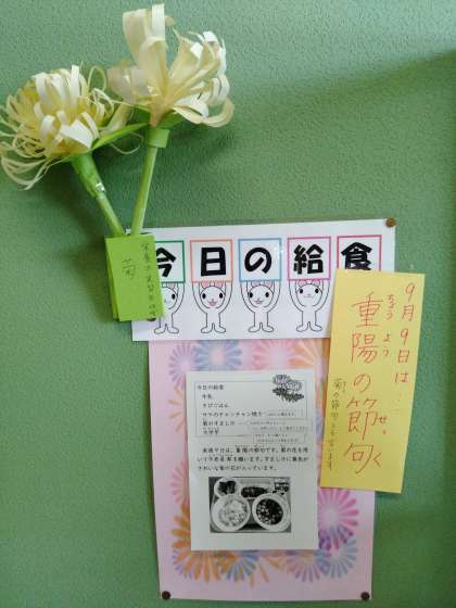 服部栄養専門学校から来ている栄養士実習生が、色紙で菊の花を作って行事食を盛り上げてくれました。