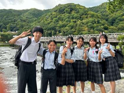 渡月橋(嵐山)をバックに記念写真です。