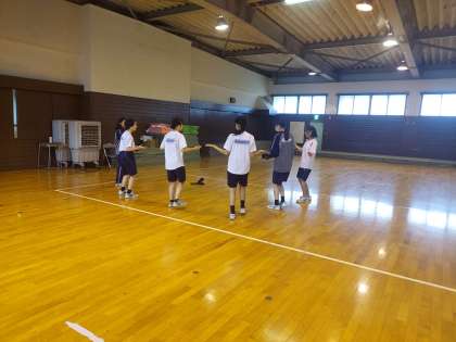 映像に関するゼミのメンバーが小体育館で、タブレットの映像を見ながら振り付けをしていました。