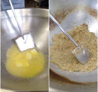 ルーは、大きなバターをかたまりを焦がさないように溶かしています。