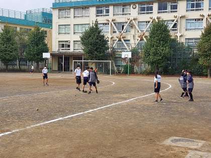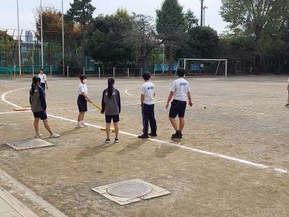 3年生の保健体育の様子です。柔らかいバットとボールを使用し、バッティングの練習を行っていました。3年生は進路に向かう時期になっていますが、保健体育の授業では、和やかな様子がうかがえました。