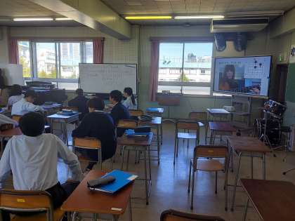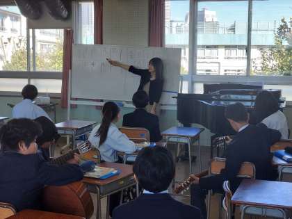 1年生の音楽では、先生の「メリーさんのひつじ」のピアノに合わせて、ギターのコードDとAの担当の生徒とともに演奏しました。可愛らしい演奏で和みました。