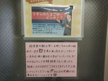 給食掲示物には「うずらの卵がピンチ」と書かれていました。私の感想は、「へ〜そうなんだー!知らなかった」といった印象でした。給食には使用されている食材ではありますが、そう言えば家庭ではあまり食していない印象があります。