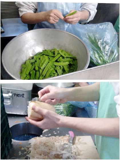 彩りのさやえんどうも3kgで約1000枚あり、1枚ずつ筋とりをしました。