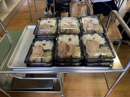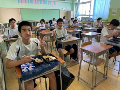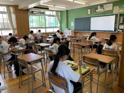 感染防止を考慮して、全員が前を向いて食事を摂っています。様々なランチョンマットとマイ箸でいつもとは違う給食を楽しんでいる様子です。校内にある掲示板には、一週間分の給食の献立が貼ってあります。